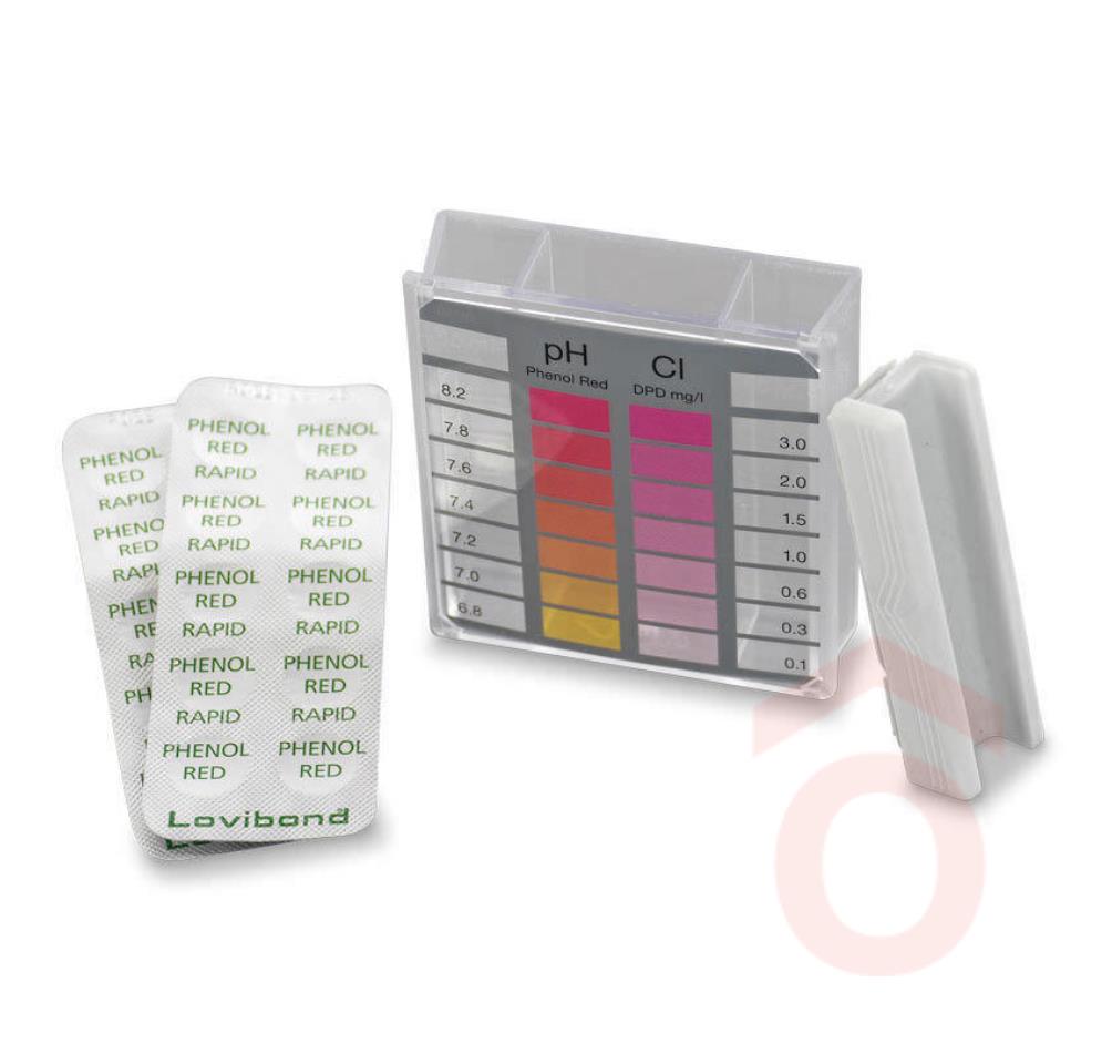 Kiszerelés: 1 szett (tárolódoboz, színskála, 20 Phenol Red, 20 DPD Rapid, útmutató)
