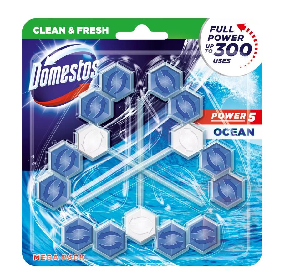 A Domestos Power5 WC-blokk ötvözi az intenzív frissességet és a higiénikus tisztaságot. Minden öblítéssel segít eltávolítani a szennyeződéseket, miközben hatékonyan lép fel a vízkő ellen is. Erőteljes habzásának köszönhetően a WC friss és tiszta marad két öblítés között is.