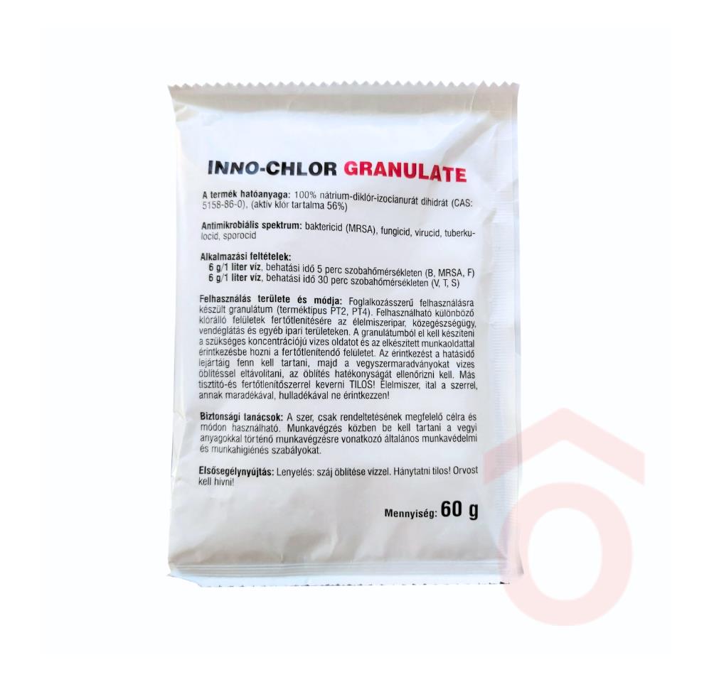 Az Innoveng Inno Chlor Granulate egy koncentrált klórtartalmú fertőtlenítő granulátum, amely különféle ipari területeken – például az élelmiszeriparban, közegészségügyben vagy vendéglátásban – alkalmazható klórálló felületek hatékony fertőtlenítésére. A granulátumból a kívánt koncentrációjú vizes oldatot kell elkészíteni, majd azzal kezelni a felületeket.