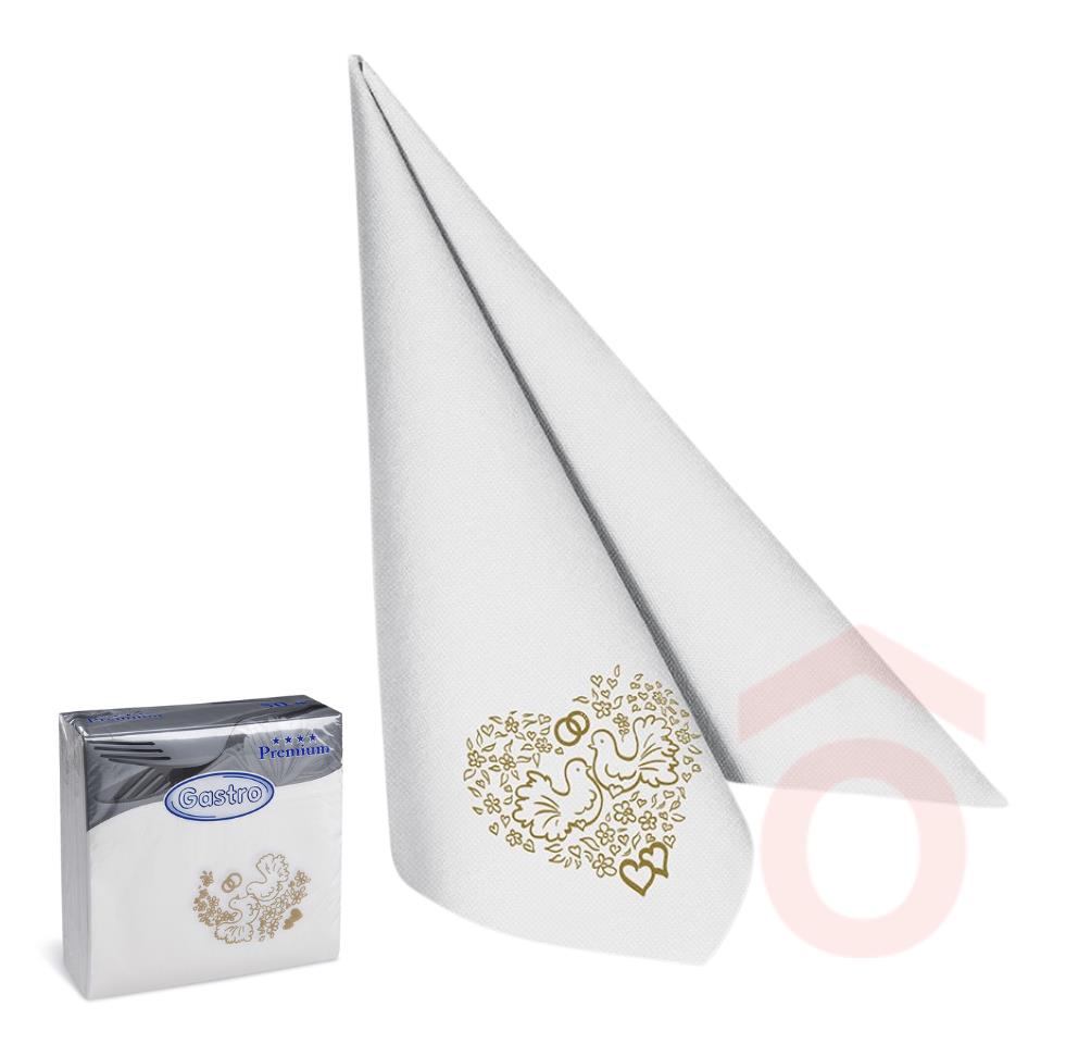 Luxus papírszalvéta, elegáns színben, esküvői díszítéssel. A szalvéták jó nedszívó képességűek, nedvesen nagyon erősek, erősségük és szerkezetük ideális helyettesítője a textilszalvétának. Ünnepi alkalmakra alkalmas.