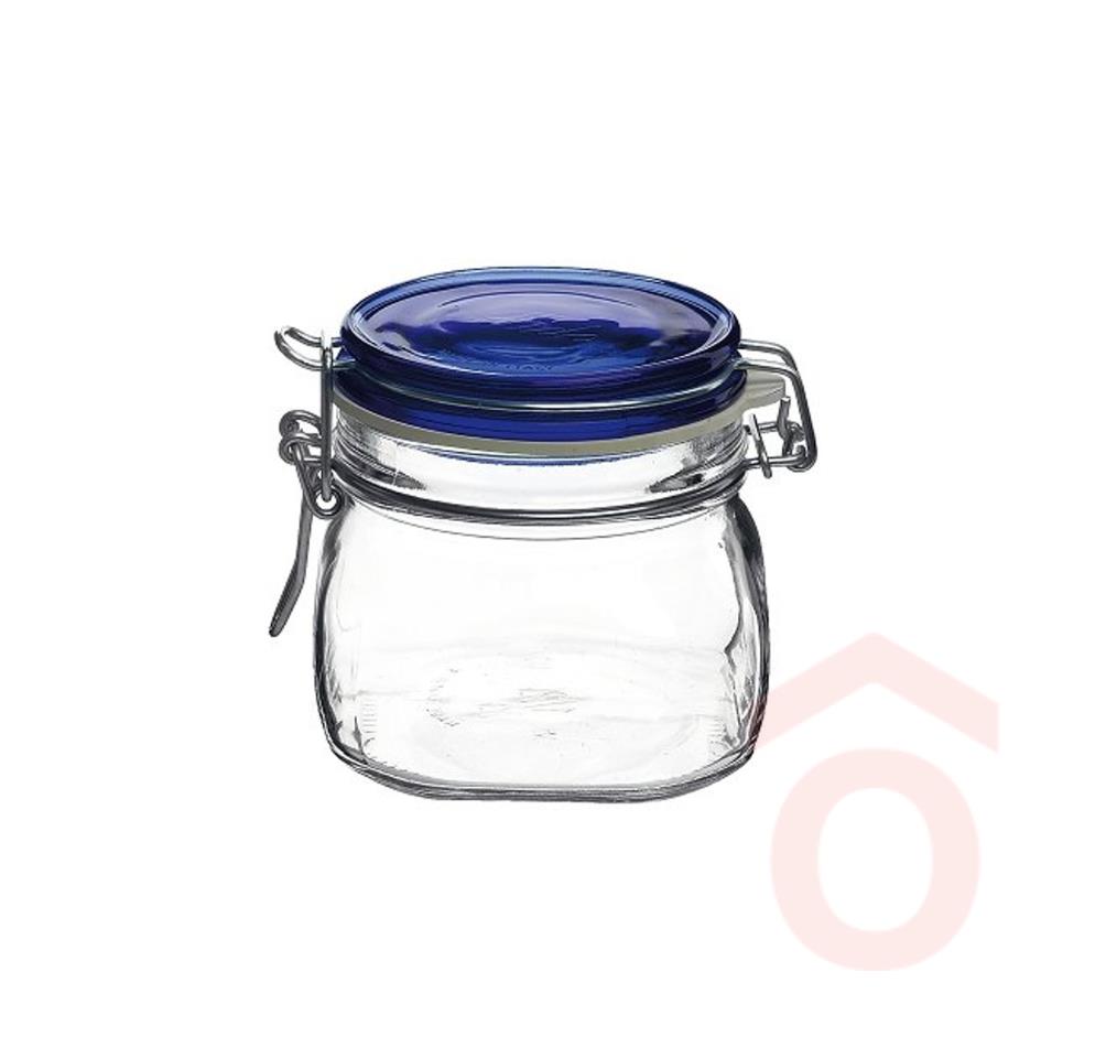 Légmentesen záró FIDO Blue tároló üveg üvegtetővel és fémcsattal, a tető gumitömítéssel van ellátva, a csat drótszerkezete mosogatógépben nem mosható (nem rozsdamentes).
