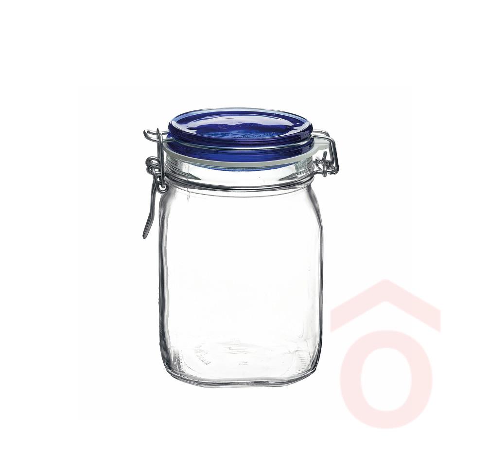 Légmentesen záró FIDO Blue tároló üveg üvegtetővel és fémcsattal, a tető gumitömítéssel van ellátva, a csat drótszerkezete mosogatógépben nem mosható (nem rozsdamentes).