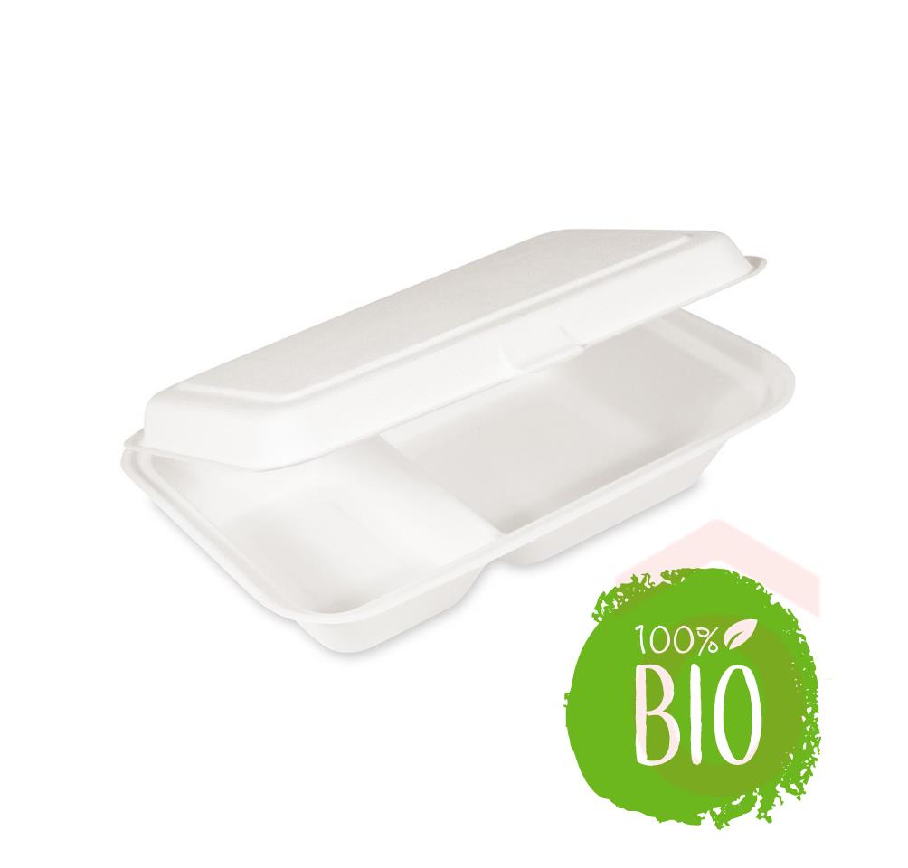 Két rekeszes BIO elviteles menübox, mely környezetbarát cukornádból (bagasse) készült. Az innovatív alapanyag a cukorgyártás melléktermékeként keletkezik, így fenntartható és biológiailag lebomló alternatívát kínál a müanyag csomagolókkal szemben.