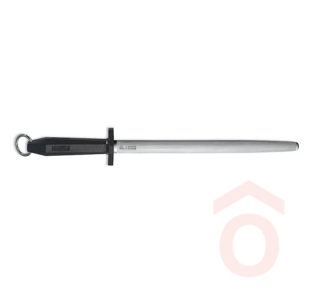 A hosszú idő óta jól bevált F. Dick élező acélpenge, ergonomikus kialakítású markolattal, ujjvédelemmel, a fogantyú végén acélkarikával. Biztonságos és higiénikus, a hatályos élelmiszeripari szabályozásoknak megfelelő.