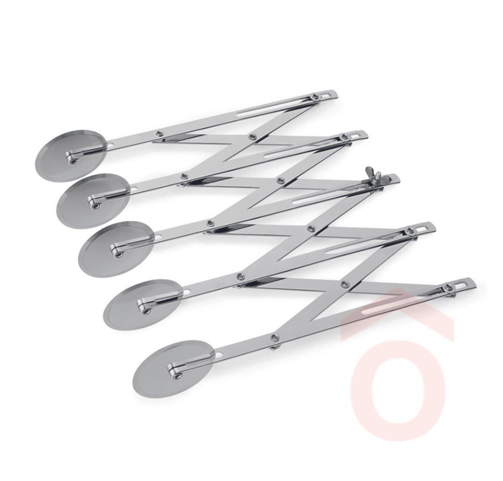Rozsdamentes acélból készült 5 kerekes tésztavágó. Összecsukott állapotban 24 cm hosszú és 6 cm széles, a legnagyobb nyitott állapotában a szélessége 50 cm. A vágófejek átmérője 5,5 cm. A szeletszélesség beállítása után egy kis csavar meghúzásával tudunk tökéletes szeleteket vágni.