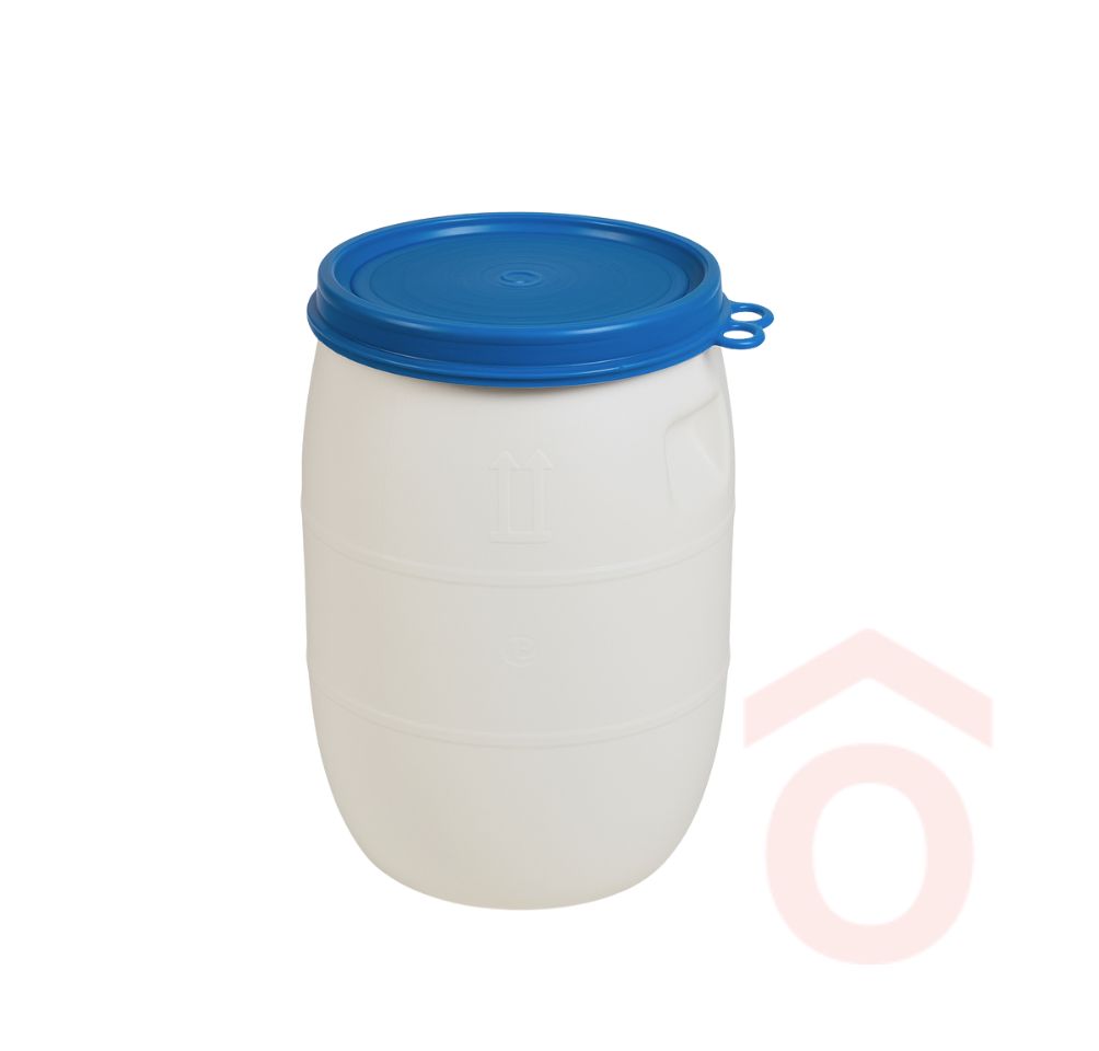 60 literes, élelmiszeripari minőségű műanyag hordó pattintós tetővel, amely ideális folyadékok, ömlesztett áruk vagy erjesztendő termékek biztonságos tárolására. A teljesen nyitható betöltőnyílás kényelmes feltöltést és tisztítást biztosít.