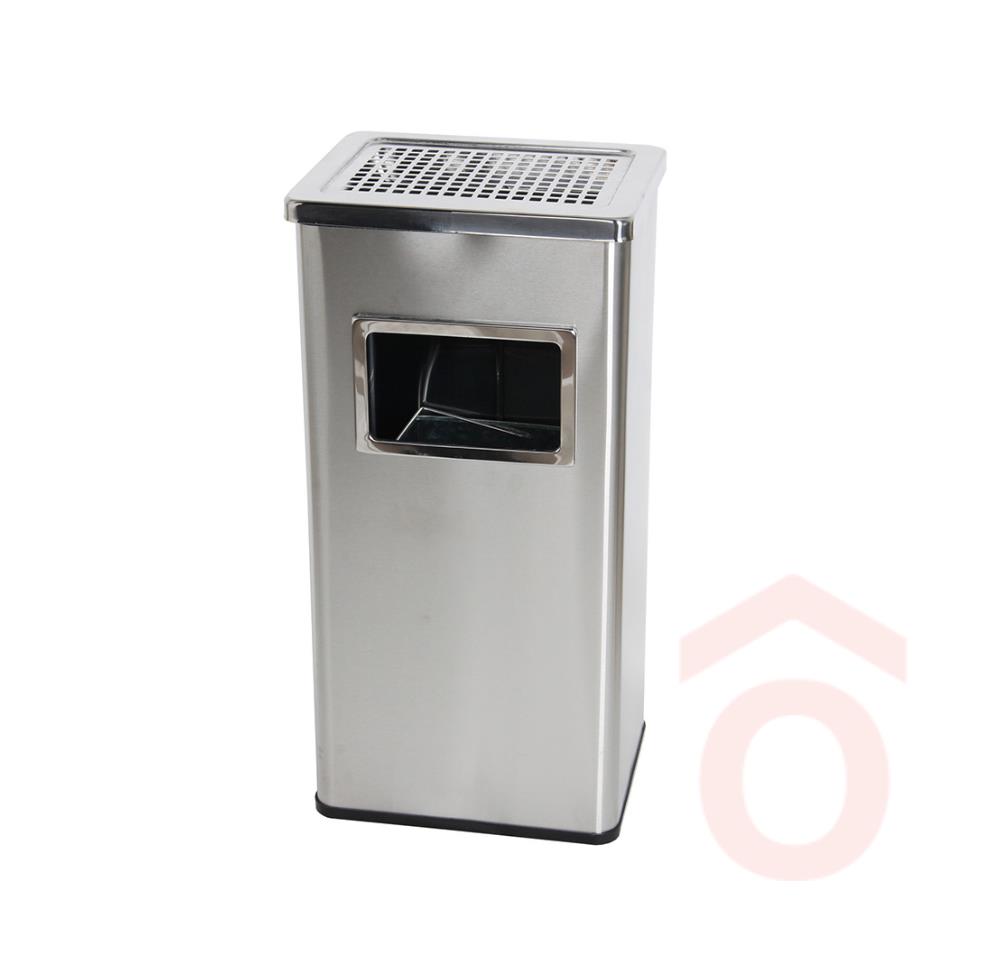 Rozsdamentes acél szögletes álló hamutartó, kivehető hamutartó résszel és szemeteskukával.