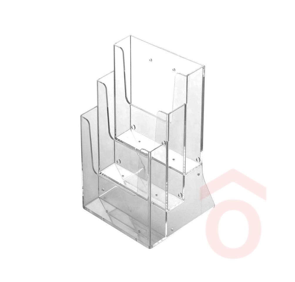 Ez a 3 rekeszes szórólaptartó ideális választás, ha egyszerre többféle A4-es kiadványt, prospektust vagy katalógust szeretnél rendezetten, ízlésesen kihelyezni egy asztalon vagy pulton. A kialakítása lehetővé teszi, hogy akár falra is rögzítsd, így rugalmasan alkalmazható a tér adottságaihoz.