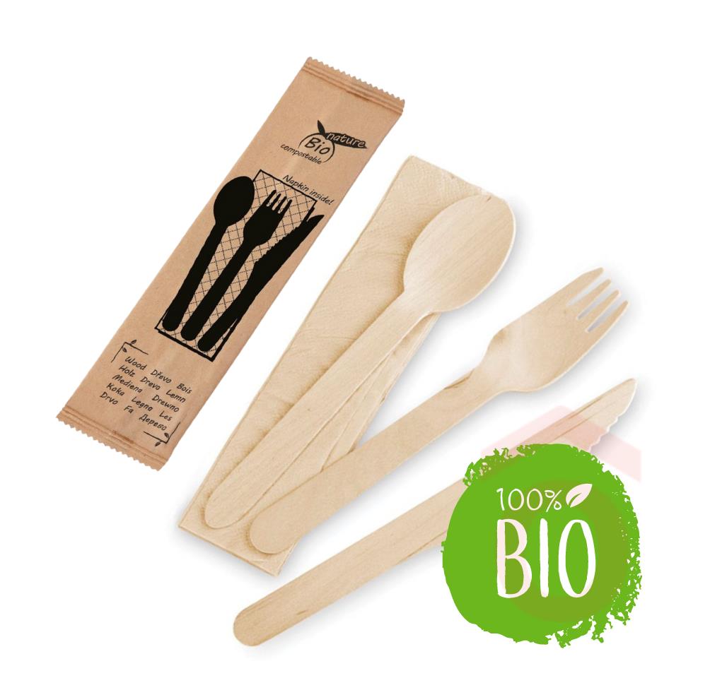Környezetbarát evõeszközkészlet, amely ideális kempingezéshez, elviteles ételekhez, rendezvényekhez vagy catering eseményekre. A szett tartalmaz egy fakanalat, fából készült villát, egy kést és egy szalvétát, egyesével papírcsomagolásban.