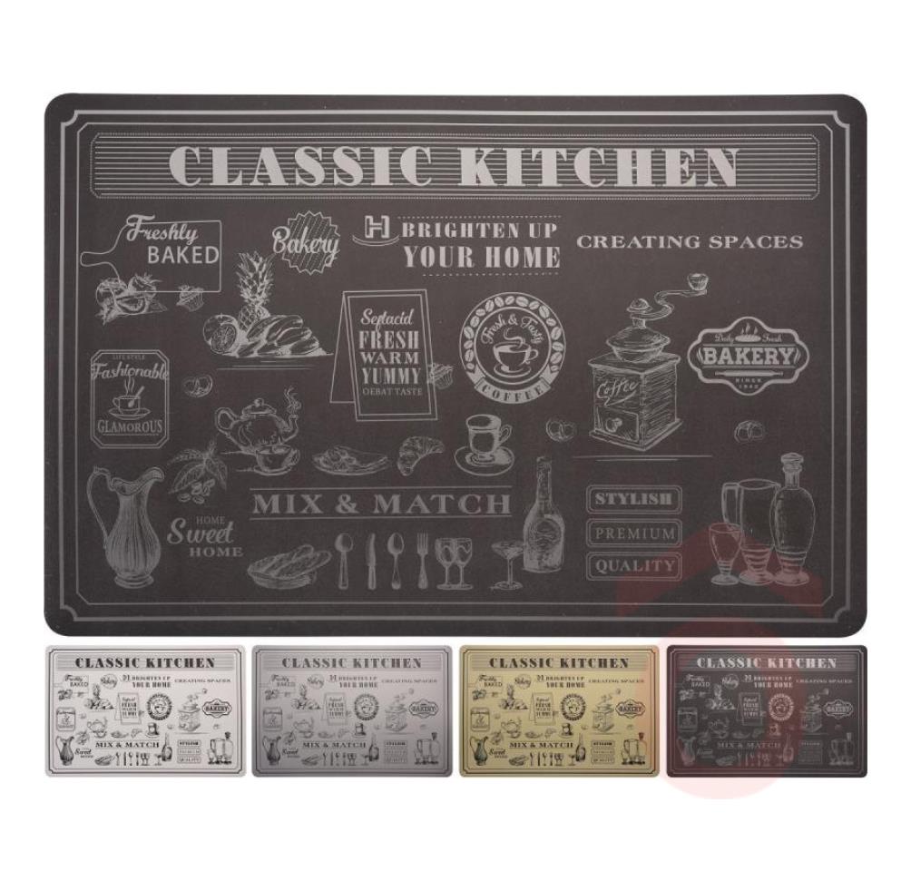 Műanyag tányéralátét klasszikus konyhai rajzolt grafikai designnal, 4 féle színben (képen látható minta).