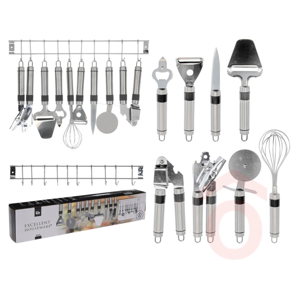 9 részes konyhai eszközszett, rozsdamentes acélból, falra szerelhető állvánnyal. Ebben a konyhai készletben megtalál mindent, amire szüksége van: konzervnyitó, hámozó, üvegnyitó, pizzavágó, habverő, fokhagymaprés, sajtszeletelő és kés.