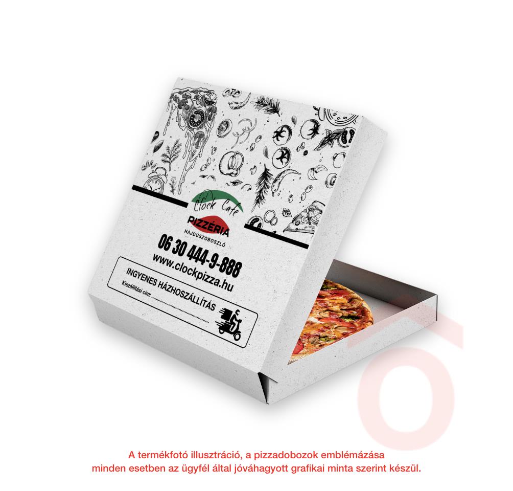 A termékfotó illusztráció, a pizzadobozok emblémázása minden esetben az ügyfél által jóváhagyott grafikai minta szerint készül.