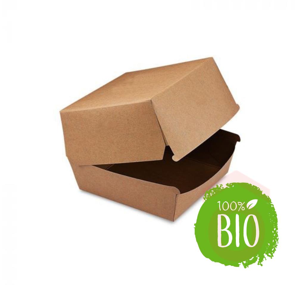 Környezetbarát, lebomló papírdoboz hamburgerek és street food ételek elviteléhez. Ez az egyszerhasználatos csomagolóeszköz ideális büfék, gyorsétterem-láncolatok és rendezvényszervezők számára. A natúr kraft szín letisztult megjelenést biztosít és hangsúlyozza a fenntarthatóságot.