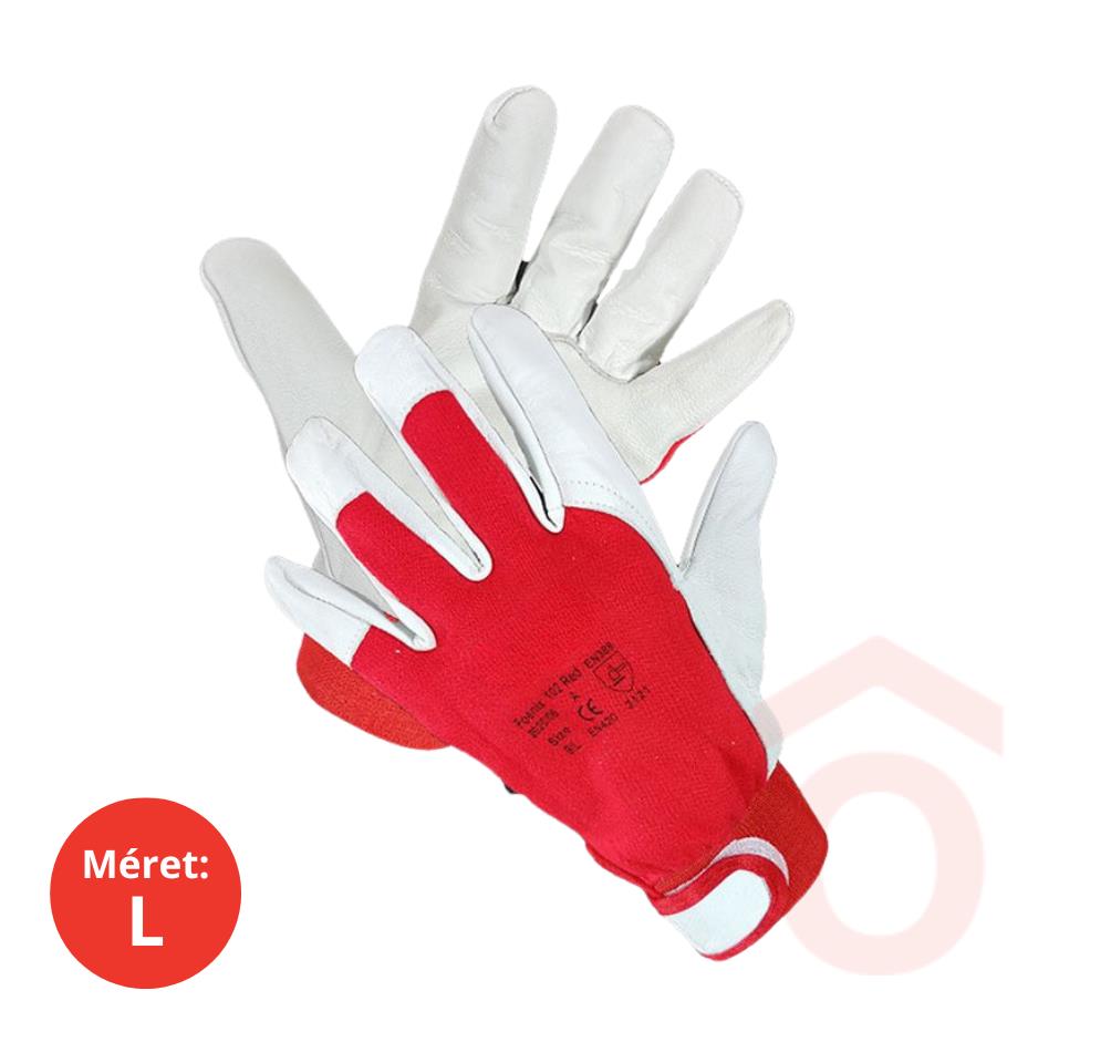 Természetes juhbőrből készült tenyér és ujj részek, kötött pamut kézhát, 30 mm gumírozott, elasztikus, tépőzáras mandzsettával.Védelmi képesség: EN 420:2003+A1:2010 EVE 2. kategória – közepes, általános kockázat elleni védelemre EN388 2121X