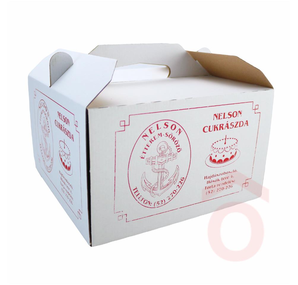 Az összehajtható, papír tortadoboz segítségével könnyen és biztonságosan szállíthatod tortádat. Egyedi nyomattal - Nelson Hotel részére.