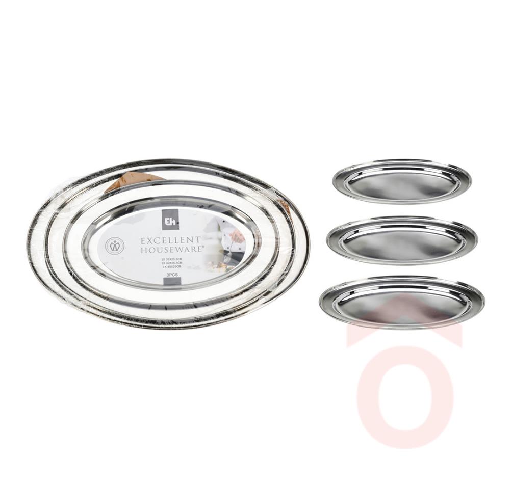 3db rozsdamentes acélból készült tálcakészlet fényes felülettel, különböző méretben, különböző alkalmakra a tálcák alkalmasak kávé, italok és rágcsálnivalók, desszertek és előételek felszolgálására.
