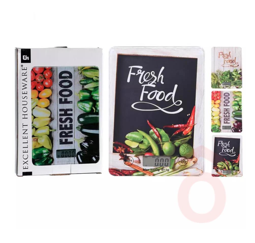 Az Excellent Houseware konyhai digitális mérleg praktikus és gyors segítség a konyhában, amely megkönnyíti a hozzávalók pontos mérését. Üveg anyagú, háromféle gyümölcs mintázattal, mely stílusos megjelenést biztosít.
