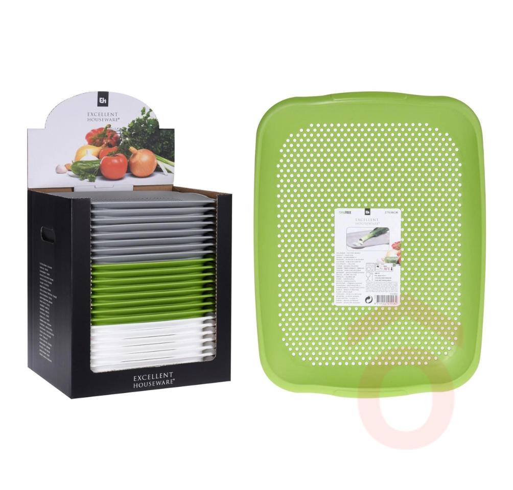 A tartós polipropilén anyag könnyű, mégis stabil használatot biztosít, a kialakított fülek pedig megkönnyítik az emelést és az öntést. A tálca vágódeszkaként is használható, így előkészítéshez, aprításhoz és szárításhoz is ideális egy eszközben. Letisztult, modern színvilága (világos, zöld és grafitszürke) jól illeszkedik bármely konyhába.