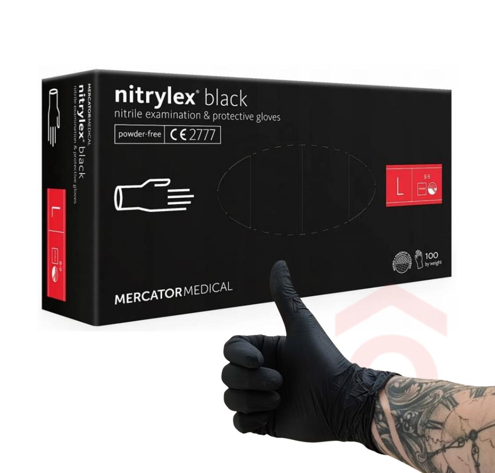 Nitrylex® black hagyományos púdermentes nitril kesztyű fekete színben, amely védelmet nyújt a baktériumok, gombák és vírusok ellen. Ujjbegyeken texturált. A kesztyűk univerzálisan használhatók (jobb,bal kéz), szennyeződés nem látszik rajtuk. Felhasználás: Élelmiszer-feldolgozás, háztartási és gépészeti munkák, takarítás, tetováló szalonok.