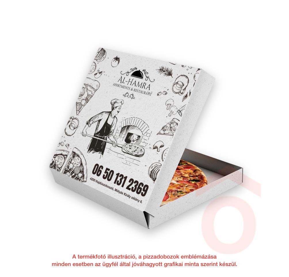 A termékfotó illusztráció, a pizzadobozok emblémázása minden esetben az ügyfél által jóváhagyott grafikai minta szerint készül.