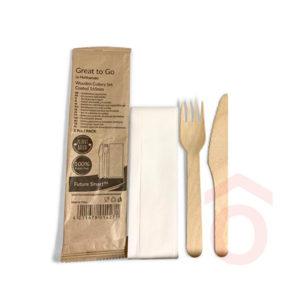 Környezetbarát, lebomló evõeszközkészlet kempingezéshez, rendezvényekre és elviteles ételekhez. A csomag tartalmaz egy fa villát, egy kést és egy szalvétát, melyeket higénikusan, egyesével papírcsomagolásba helyeztek.