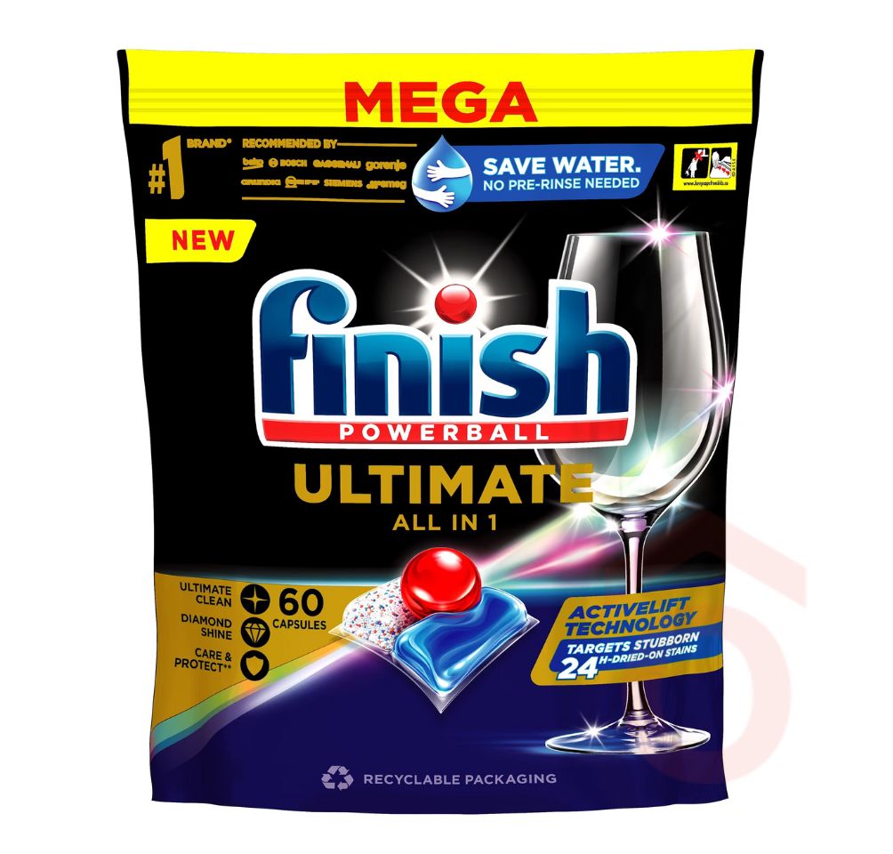 Kiemelkedő tisztaság és ragyogás még alacsony hőmérsékleten is! A Finish Ultimate All In One mosogatógép kapszula három gyorsan oldódó kamrájának köszönhetően hatékonyan távolítja el a zsíros szennyeződéseket és a rászáradt ételmaradékokat, még az ökociklus során is. Biológiailag lebomló, 100%-ban vízben oldódó bevonatának köszönhetően környezetbarát választás. A csomagolásmentes formula fenntartható és praktikus megoldást kínál a mindennapi mosogatáshoz.