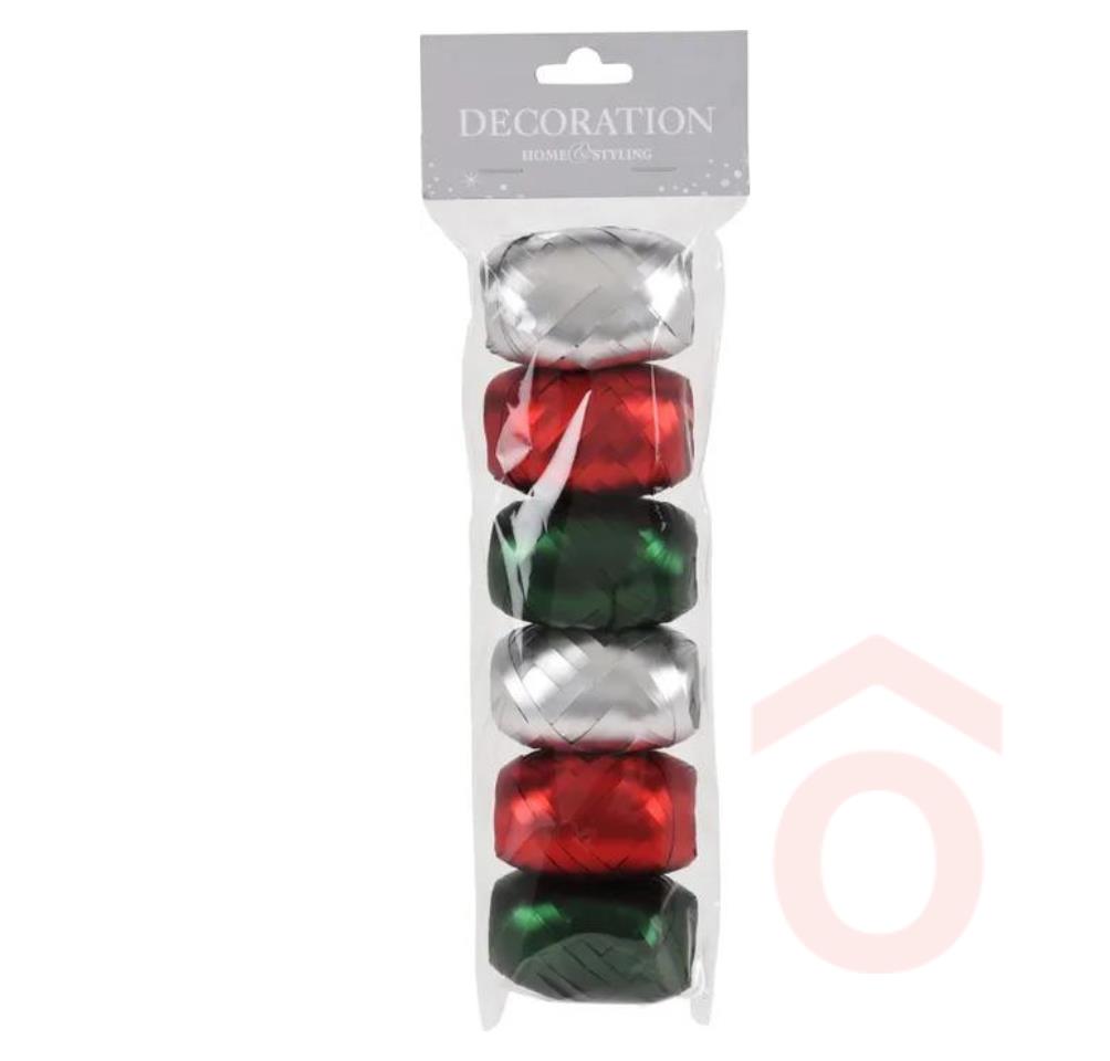 Karácsonyi tradícionális színekben pompázó fényes díszszalag. Minden színből 2-2-2 db található.