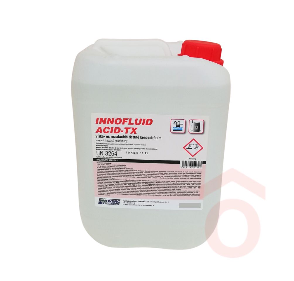 Az Innoveng Innofluid Acid-TX hatékony vegyszer élelmiszeripari berendezések, gyógyfürdők, ivóvíztárolók és hasonló létesítmények tartályaiban, csővezetékeiben lerakódott savban oldódó oxidok, karbonátok, vízkő, borkő és tejkő eltávolítására. Emellett kis mértékű zsíros vagy szerves szennyeződéseket is eltávolít, így a felületek egyenletesen tiszták lesznek.