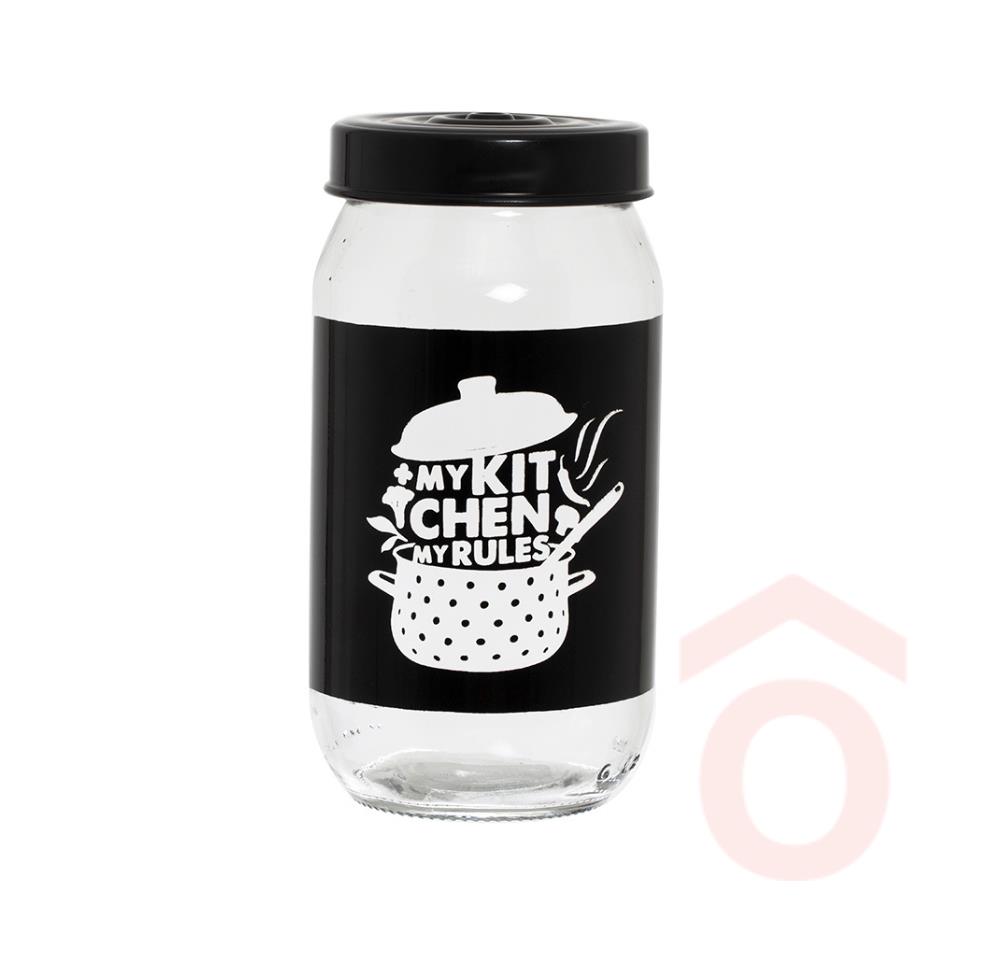 Fekete kitchen mintázatú fűszertartó, nem csak fűszereket, de bármilyen élelmiszert is tárolhatsz benne. Üveg falának köszönhetően mindig látható a tartalma.