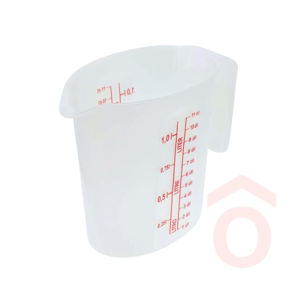 Ovális alakja miatt könnyen önthető és használható. Két oldalon bejelölve liter illetve grammban.