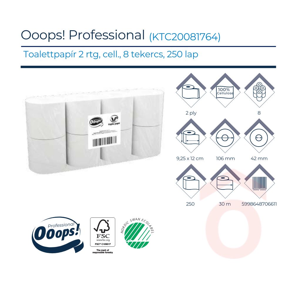 Az Ooops! Professional toalettpapír kifejezetten vendéglátóhelyek, közületek és ipari felhasználók számára készült. A 2 rétegű, 100% cellulózból készült papír egyesíti a megbízható nedvszívó képességet a kellemes puhasággal, miközben gazdaságos megoldást kínál.