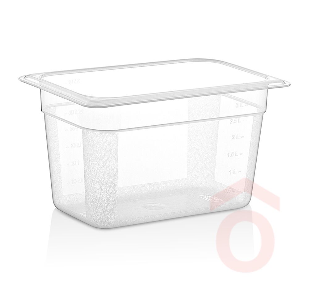 Polipropilénből készült GN edény, ételek tárolására, szállítására, bemutatására használt tároló edény. Ellenálló hőmérséklet -40-tól + 70°C között. Egymásba rakható.