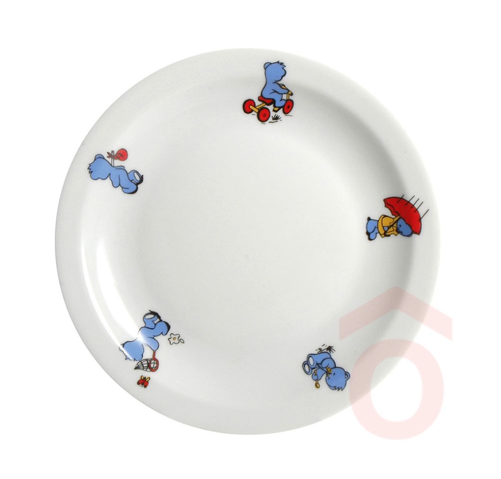 Porcelán lapostányér, gyermekeknek. A tányér szélén medvés díszítés található. Mosogatógépben mosható.