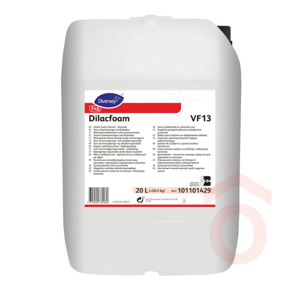 A DilacFoam VF13 savas habtisztítószer és vízkőoldó speciálisan az élelmiszer-, ital- és tejipari berendezések napi és idõszakos tisztítására lett kifejlesztve. Magas habzású nedvesítõszereket és inorganikus savakat tartalmaz, melyek hatékonyan oldják a vas-, mangán- és ásványi lerakódásokat.