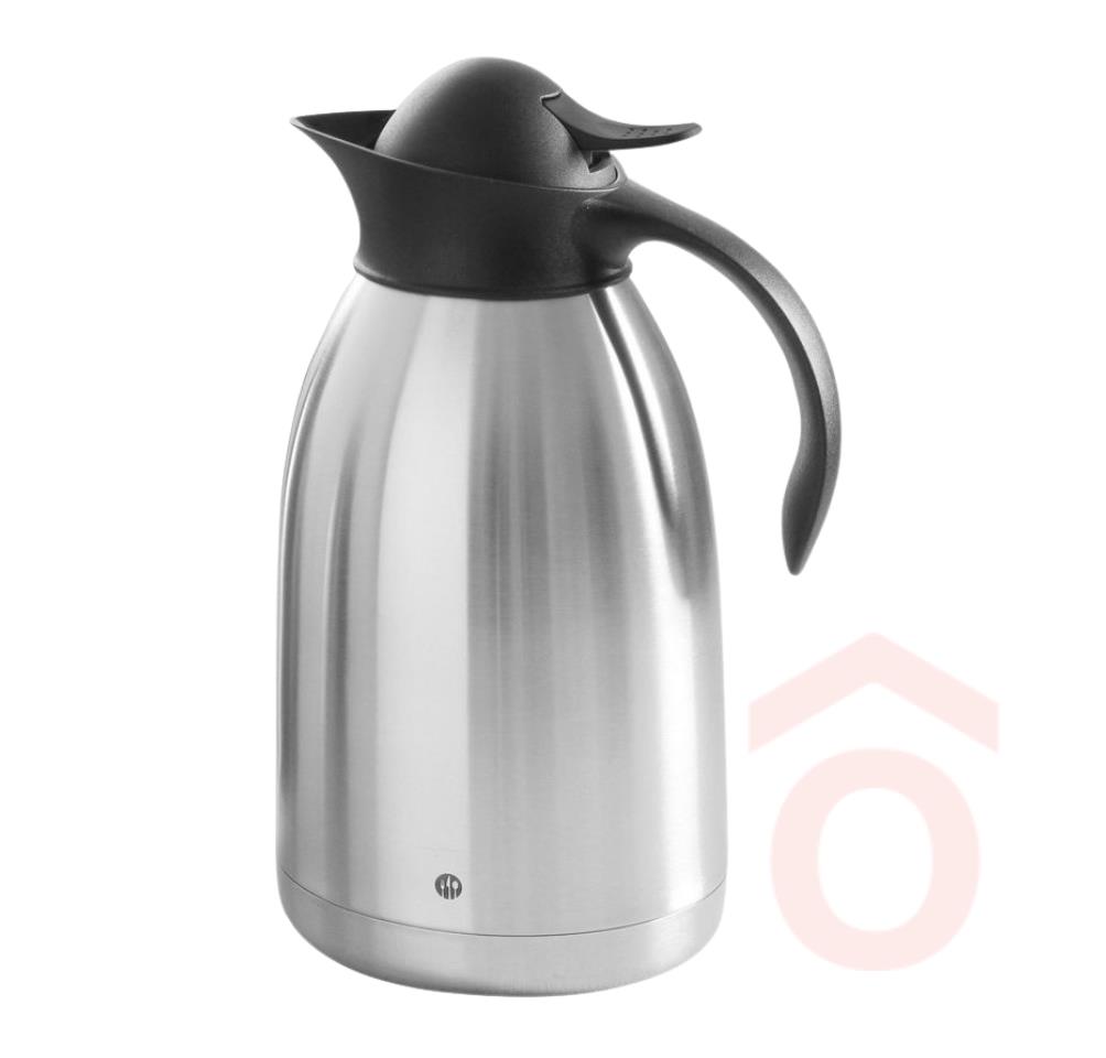 Duplafalú rozsdamentes acélból készült termosz. Fekete polipropilénból készült nyomógombos tetővel.