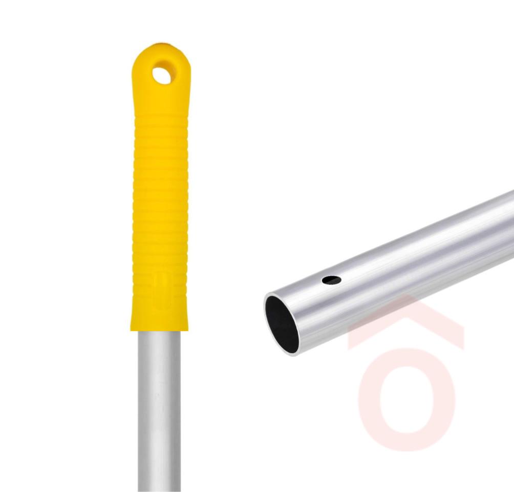 Lapos felmosó talphoz, csavarós felmosó fejhez, padlólehúzóhoz, illetve a legtöbb szorítós csatlakozású eszközzel kompatibilis csiszolt alumínium felmosónyél, kék színű markolattal, 1 mm vastag anyagból.