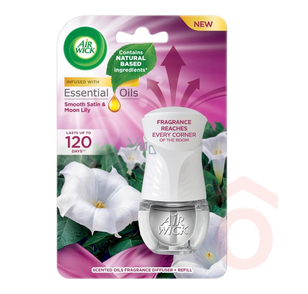 Az Air Wick elektromos légfrissítő készülék és utántöltő kombinációja akár 80 napig folyamatos, kellemes illatot biztosít – méghozzá a legalacsonyabb illatszint mellett, napi 8 órás üzemmódban :contentReference[oaicite:1]{index=1}. A természetes illóolajokkal gazdagított bársonyos szatén és éji liliom illat hangulatos frissességet nyújt bármely helyiségben.