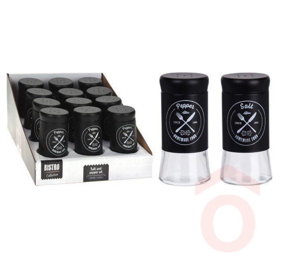 Üvegből és fémből készült só- és borsszóró készlet bistro design nyomattal. Alkalmas mindennapi használatra otthoni, valamint éttermekben és egyéb vendéglátóhelyeken.