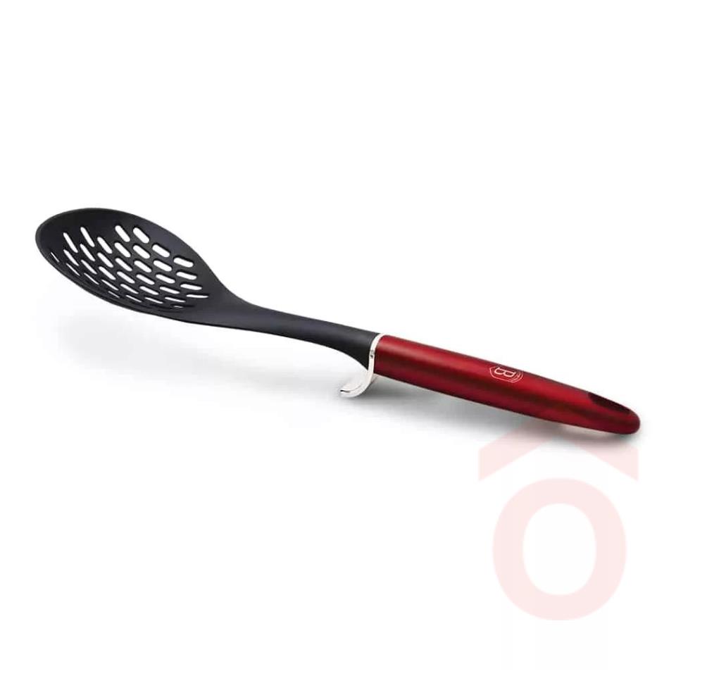 A lyukas fej segít, hogy a folyadék nagy része visszafolyjon az edénybe, így könnyebb a zöldségek, tészták vagy húsdarabok kiemelése. Kényelmes fogást biztosít, miközben a fekete és metál vörös színösszeállítás tökéletesen illeszkedik a Metallic Line Burgundy termékcsalád többi konyhai eszközéhez. Ha praktikus, ugyanakkor designos kiegészítőt keresel a főzéshez és tálaláshoz, ez a lyukas főzőkanál remek választás.