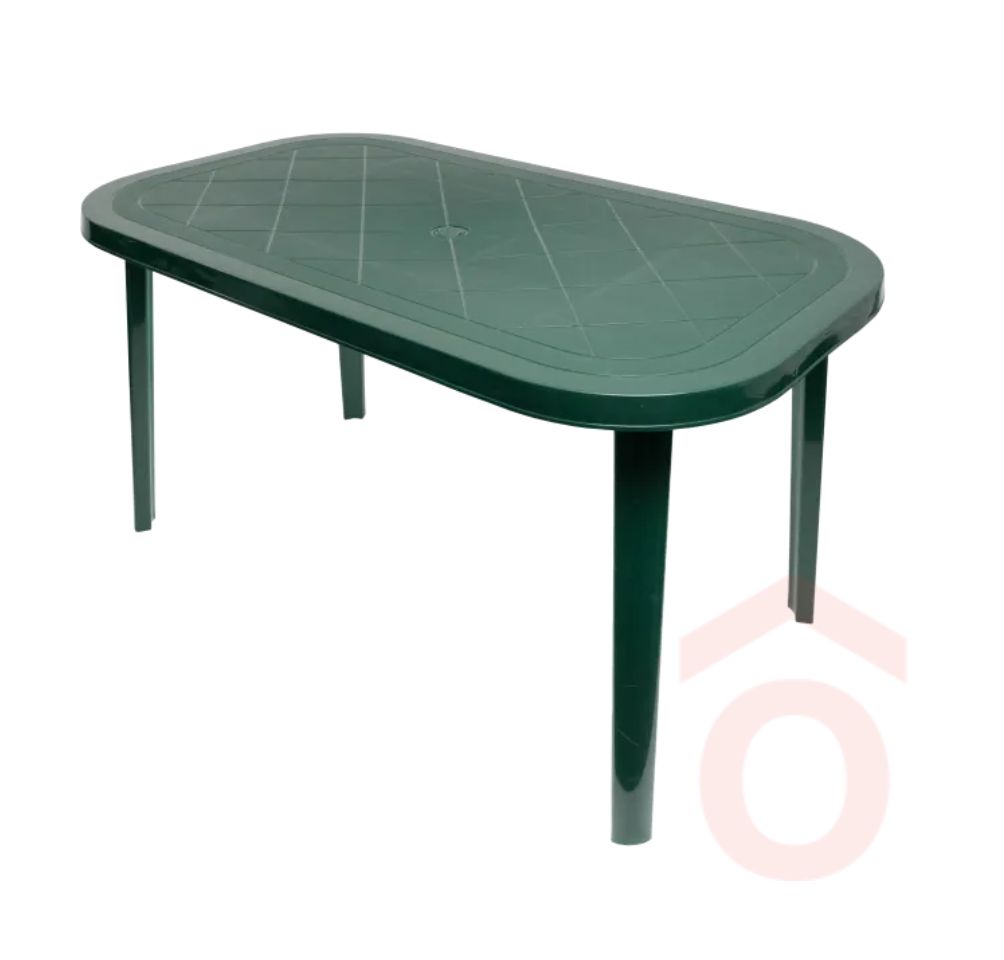 Időjárásálló, UV-álló műanyag asztal ovális kialakítással, középen praktikus napernyő tartó lyukkal. Könnyen tisztítható és egyszerűen mozgatható – tökéletes választás teraszra, erkélyre vagy kertbe.