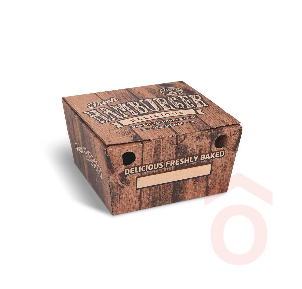 Praktikus, egyszerhasználatos hamburgeres papírdoboz kraft alapszínnel és nyomott mintával, amely kiváló választás gyorséttermi, büfés és rendezvényi felhasználásra. A dizájnos kivitel emeli a tálalás vizuális értékét, miközben a doboz megfelel a modern elvárásoknak.