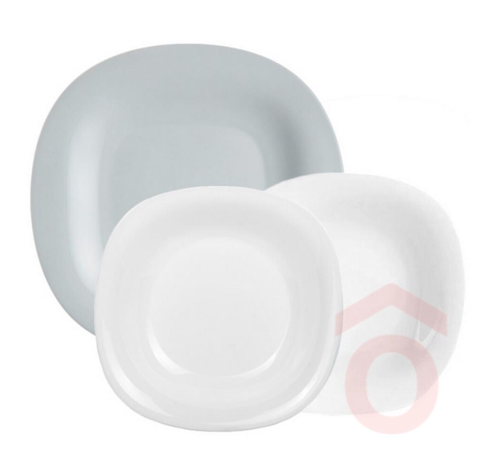 Az étkészlet fehér és szürke tányérokból áll, melyek edzett üvegből készülnek. A speciális hőkezelés biztosítja a jobb minőséget és a zúzódásokkal, valamint a hőmérsékletváltozásokkal szembeni fokozott ellenállást. Az üveg nem porózus, így nem képes mikroorganizmusokat megtartani, és teljes mértékben higiénikus. A tányérok lekerekített szélei és szögletes alapja modern megjelenést kölcsönöz, amit a szürke és fehér színek még inkább kiemelnek. Ez a semleges árnyalat minden étkezőben és konyhában tökéletes választás, függetlenül a dekorációtól.