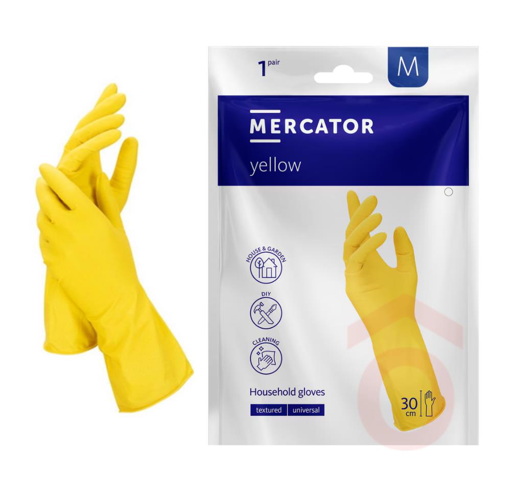 A sárga háztartási kesztyűk érdesített tenyérrésszel rendelkeznek, amely megkönnyíti a nedves környezetben végzett munkát, és javítja a fogást, valamint a mozdulatok irányítását. Természetes gumilatexből készült, rugalmas és kényelmes, így biztosítja a precíz mozdulatokat. Hosszú, 300 mm-es szára védi az alkart.