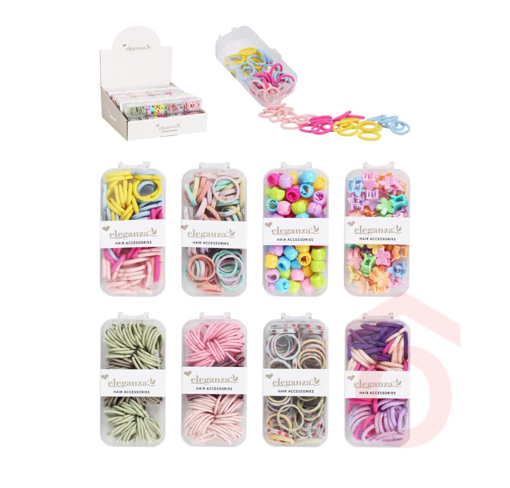 Színes és praktikus hajdíszek minden alkalomra! Az Eleganza hajgumi és hajgyöngy szett 8 különböző összeállításban, vidám színekben érkezik, így ideális választás gyerekeknek és felnőtteknek egyaránt. A szett tartalmaz puha, rugalmas hajgumikat, valamint műanyag hajgyöngyöket és csatokat, amelyek könnyen használhatók hajfonáshoz, hajdíszítéshez vagy játékos frizurákhoz. Átlátszó műanyag dobozban, így könnyen rendszerezhető.