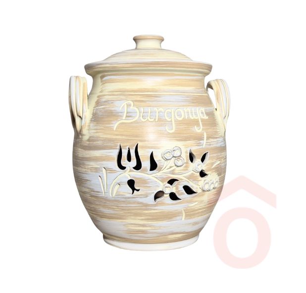Elegáns, kézzel készített kerámia tároló Burgonya felirattal és virágos‐szellőző mintázattal. Praktikus fedővel és oldalsó fogantyúkkal a könnyű mozgatásért. Ideális konyhai tárolásra, frissen tartja a burgonyát.