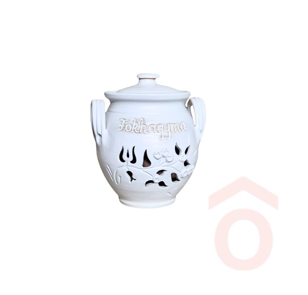 Kézzel festett és csiszolt kerámia tároló “Fokhagyma” felirattal és szellőző virág‐kivágásokkal. Elérhető négy dekoratív változatban: burgonya, fakanál, cseresznyevirág és fokhagyma.