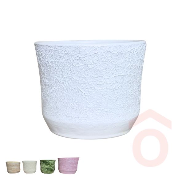 Egyedi, kézzel formázott kerámia kaspó rusztikus, tapicskolt textúrával. Elérhető több dekoratív színben (bézs, krém, zöld, rózsaszín) és több méretben, hogy tökéletesen passzoljon bármely beltéri növényedhez.