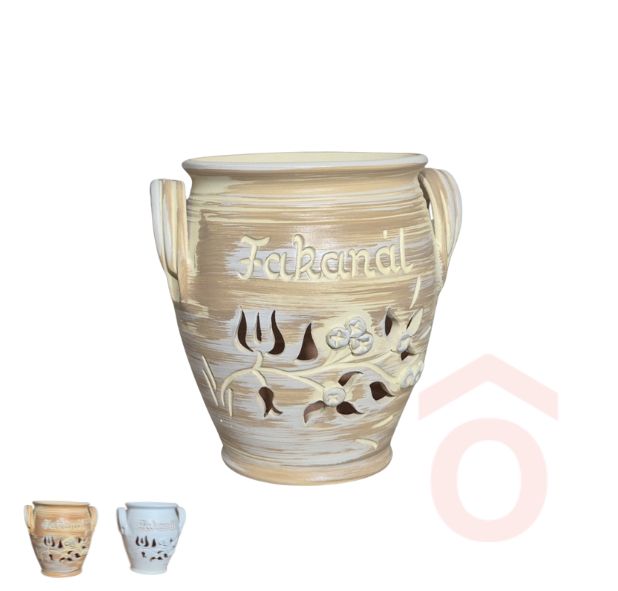Elegáns, kézzel festett és csiszolt kerámia fakanáltartó „Fakanál” felirattal és szellőző virágmintákkal. Dekoratív konyhai tároló, amely stílusosan rendezi és védi a konyhai eszközöket.