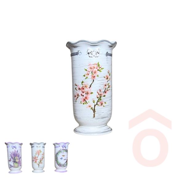 Kézzel formázott, mázas kerámia váza hullámos peremmel és dekoratív szalaggal. Elérhető három virágmintával (levendula, cseresznyevirág), a választék a raktárkészlettől függően változhat.
