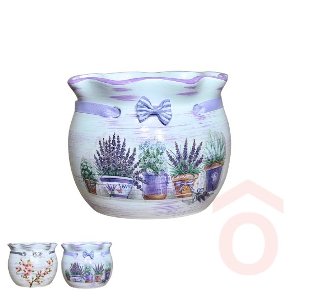 Elegáns, kézzel festett és csiszolt kerámia kaspó hullámos peremmel és dekoratív szalaggal. Elérhető két virágmintával (levendula vagy cseresznyevirág), továbbá három méretben a webshopban.